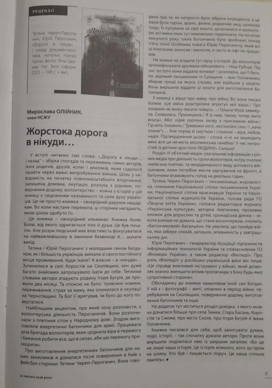 «Дорога в нікуди… і назад» — збірка спогадів та переживань самих авторів іхніх родичів, друзів, колег і земляків, яким судилося пройти через важкі випробування війною Шлях у невідомість на початку повномасштабного вторгнення, залишена домівка, окупація, розлука з рідними, повернення додому, волонтерство — кожна з історій у цій книжці е свідченням незламності та сили духу українців. Це не просто книжка — своєрідний дарунок нащадкам. Бо коли настане перемога, ці сторінки нагадають, якою ціною здобуто її».