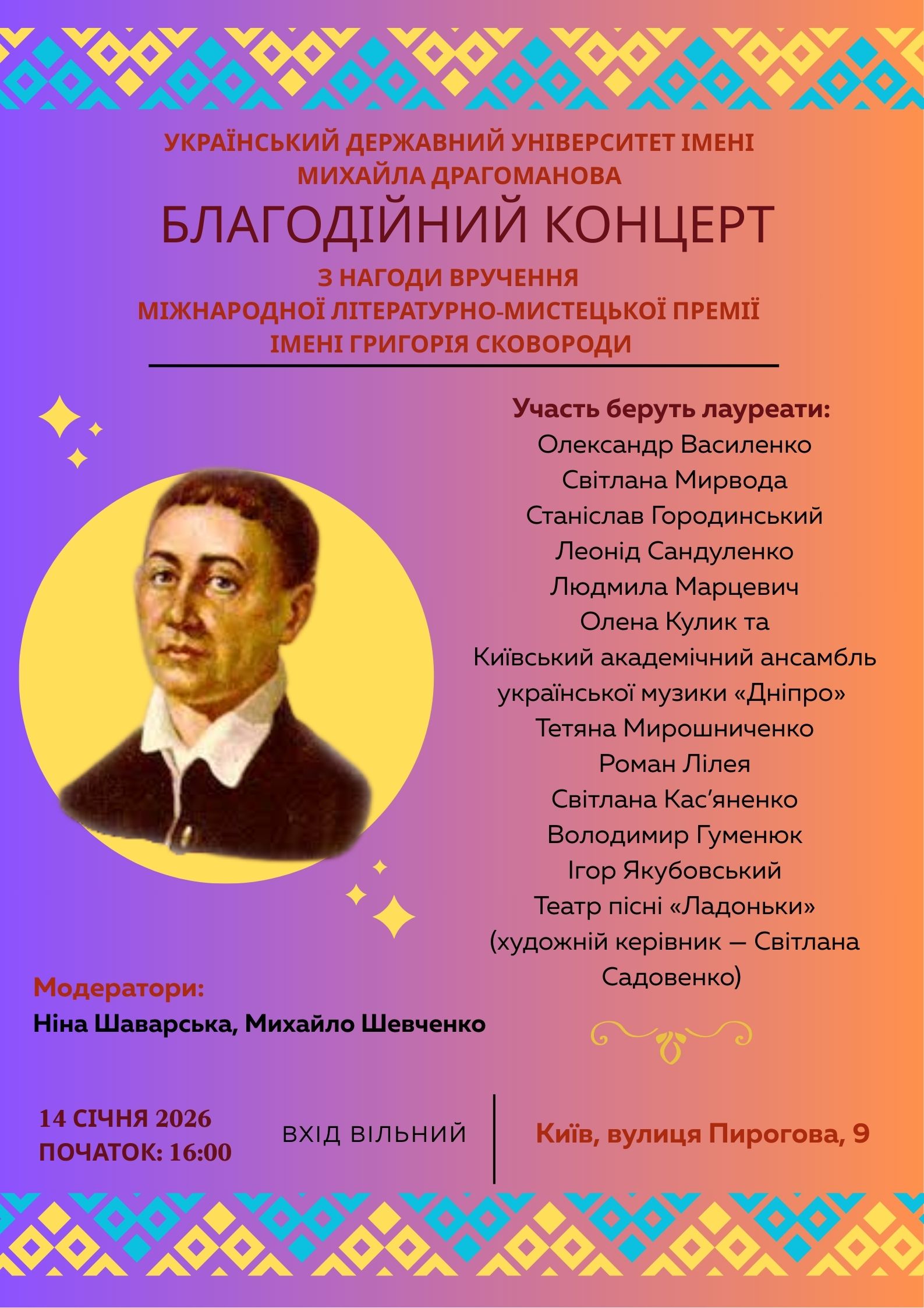 14 січня 2026 року в Українському державному університеті імені Михайла Драгоманова (Київ, вул. Пирогова, 9) відбудеться благодійний концерт з нагоди вручення Міжнародної літературно-мистецької премії імені Григорія Сковороди