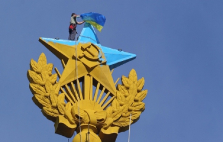 Нагадаємо: в ніч на 20 серпня на висотці пофарбували зірку в кольори українського прапора та вивісили сам прапор України. Уранці верхолази зняли прапор із будівлі.