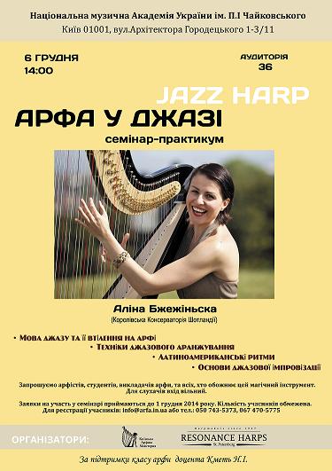 6 грудня 2014 року у НМАУ ім. П.І. Чайковського о 14:00 в аудиторії 36 відбудеться майстер-клас і семінар Аліни Бжежінської (Королівська Консерваторія Шотландії) по джазовій арфі.