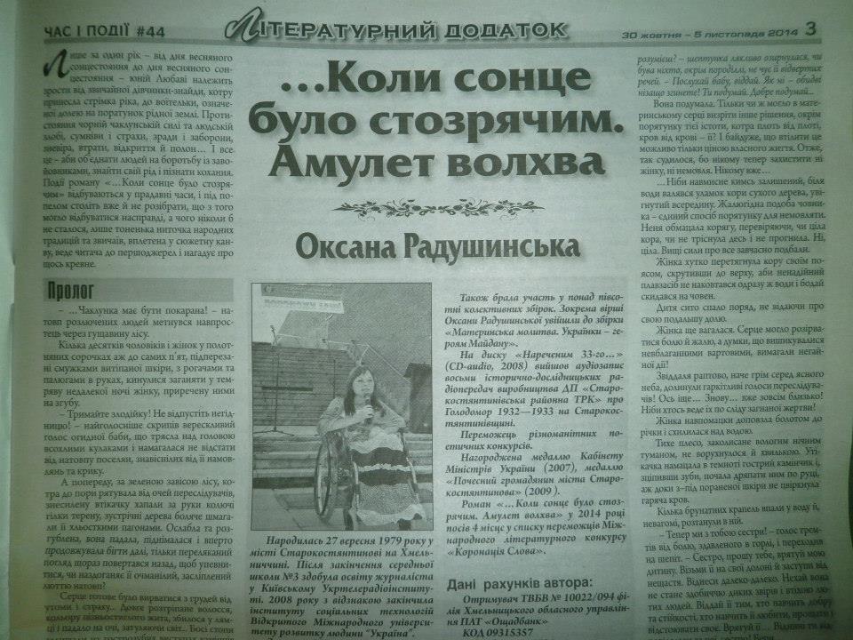 Також вже декілька днів маємо можливість читати новий, коронований у цьому році роман письменниці з Хмельниччини Оксани Радушинської «...Коли сонце було стозрячим. Амулет волхва», який надруковано у №44 Всеамериканської української незалежної газети «Час і Події». Він про кохання, війну із загарбниками та амулет волхва.